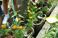 | 6月29日に京都市立紫竹小学校(5年生のクラス)で4回目の花育活動を行いました。 教室で食物連鎖の紙芝居、京野菜のお話し、今日の鉢植えのし方を説明した後、学校の花壇に移動して、実際に土・肥料入れから万願寺とうがらしの苗、虫除けを兼ねたマリーゴールド、おしゃれなヘデラを植えて水やりまでを行いました。 教室では花育スタッフの質問にたくさん手を挙げて発言してくれて、鉢植えも真剣に、教えた通りにがんばってもらい、紫竹小学校5年生のみんなに元気をいっぱいもらいました。 |