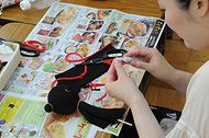 | 今回は、京都の東山にある今熊野児童館にお伺いし、花育を行ってきました。 山腹の斜面に児童館はあり、庭から京都タワーが望めます。 10:30から今回参加される親子30組が集まり、カラフルな靴下を選び「芝坊や」の制作が始まりました。ペットボトルに土を入れるのを手伝うお子さん、おかあさんに作って欲しい動物をおねだりするお子さん、一生懸命はさみで芝坊やの目をつくるお子さん、とても楽しそうでした。 作品は、アニマル系、キャラクタ系、人系に別れ、その中に父さん系も。。。(お父さんの毛がもっと生えればいいのかな?) |
