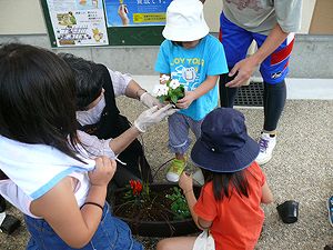 今回は小学生30名ほどとプランター、ハンギングの寄せ植えをしました。