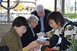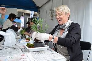| 11月2日(水)、第26回国民文化祭・京都2011の京都駅でのイベントに参加してきました。 まゆまろ風の苔玉を100セット先着の方に作っていただきました。 朝10時には準備が整い、パラパラとお客様が来る中、11時には12名(満杯)になり、あっという間に100名分用意した材料が無くなりました。 スタッフの中からは、200名分用意するれば良かったね!との声が上がる程、充実した一日でした。 来られた方の中には、岡山から来られたご夫婦、オーストラリアから来られたご夫婦もおられ、いい夫婦の日を前に、素敵な写真もいっぱい撮影できました。 |